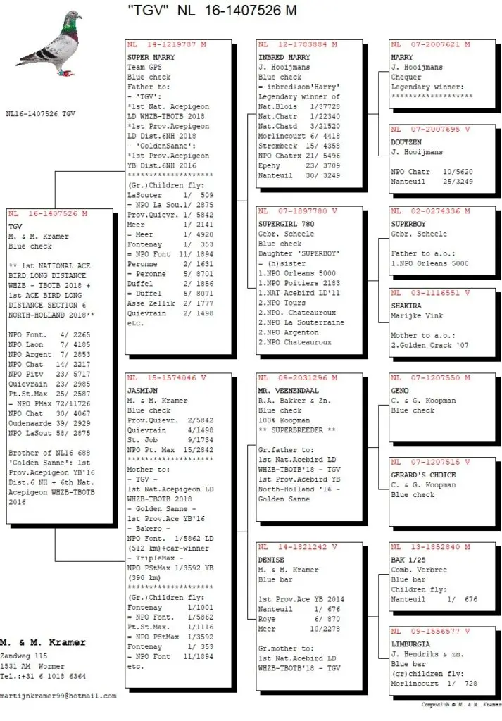 Overzicht voorouders ‘TGV’ – actieve kweekduiven in het kweekhok van M. & M. Kramer