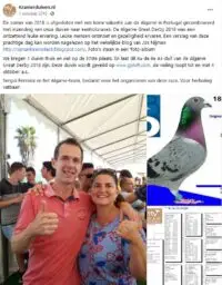 On Friday, Sept. 10, we received an e-mail from a Romanian pigeon fancier Stefan Botnar. He and his family live in Brussels and put pigeons in one-horse races in Romania. He informed us that he had bought a pigeon from us in 2018. This was a hen, the NL18-295, the ‘Algarve Fighter’, which became 6th Ace Pigeon in the AGD 2018, with a 57th place in the final against 1,244 pigeons. This happened during our very first trip to Portugal and where we met Jos and Peter Nijman, among others. That experience was one never to be forgotten! And then you sometimes think, ok, that pigeon has been sold abroad, will you ever hear from it again? Yep so, Stefan reports us that a daughter from the ‘Algarve Fighter’, which was paired against a German finalist of the AGD 2016, achieved a top result in the Race Vadu Volovat in Romania. The hen named ‘Miss Della’ flew a 3rd place in the final final race against 1,012 pigeons. Click here for the results. Certainly not a giveaway this race over 445 km, where this hen achieved a speed of 1123.56 mpm. A speed for which our pigeons are excellent. And in the semi-final she flew a 28th place against 1,094 pigeons over 360 km. The mother of ‘Miss Della’ involves the pairing ‘Fanger cock’ x ‘Shannon’. Unfortunately, the Fanger cock, originally purchased from the Fanger family in Badhoevedorp, is no longer among us. But, Shannon, that name does come up a lot in references . Wasn’t it “Jens” x “Shannon” every time?