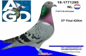 This hen concerns 50% Kramer. The mother of this hen is the NL20-1383449 daugther of ‘Denton’ x ‘Strong Lady’. Purchased through the annual GPS auction. ‘Denton’ is 2nd NPO winner Chatearoux 2016, behind 1st NPO winner Chateauroux 2016 ‘Juno’. And the ‘Strong Lady’ has been added to the growers in 2019. Mother of ‘Pepper Pot’, 3rd youngster afd.6 NH all-round 2019 and more recently from mother of ‘Phoenix’, NL20-1383312, who flew a 9th NPO Issoudun against 3,105 pigeons in our loft. Martijn Wessels let us know that he has 3 youngsters out of this hen and that he is super satisfied with his purchase.