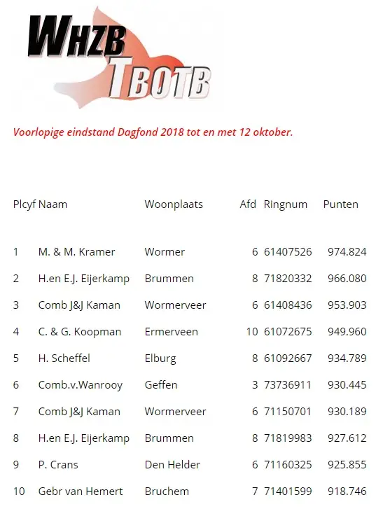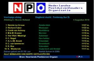 On Friday, the Track of Champions drops in the mail. And to our great surprise, we see that TGV is in provisional 2nd place in the Dagfond in the WHZB/TBOTB competition. Behind a super pigeon from Lisse. But because in some departments the 2nd flight was not released on a day long distance, the 6th and last day long distance flight also counts. So we still have a chance. But yes what are the chances of TGV taking a top prize again. Then everything has to work out.