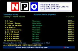 Just before basketing we hear that the flight from Gien (550 km.) will be shortened to Fontenay (513 km.) because of the heat. Well, that may not be entirely detrimental to him given the course of the previous two weeks. Normally we are not so nervous before a flight, but now the tension was running high. The last flight. Make or break… In the garden, blood hot weather, with the usual viewers in attendance. And then suddenly a pigeon. We didn’t see it coming because it was coming from the west. On the swing, on the flap and in it. Almost too fast for the camera. But it was the TGV again so that was a good sign. Forwarding. Not the first report in the club. That is usually not a good sign, but our club flies so well that it says little. So too this time. 4th report on compuclub live. That’s not bad. In each case with that became the 1st Champion Pigeon in the Division 6 North Holland and won the necessary 1st championship in the Fondclub of Division 6 North Holland.