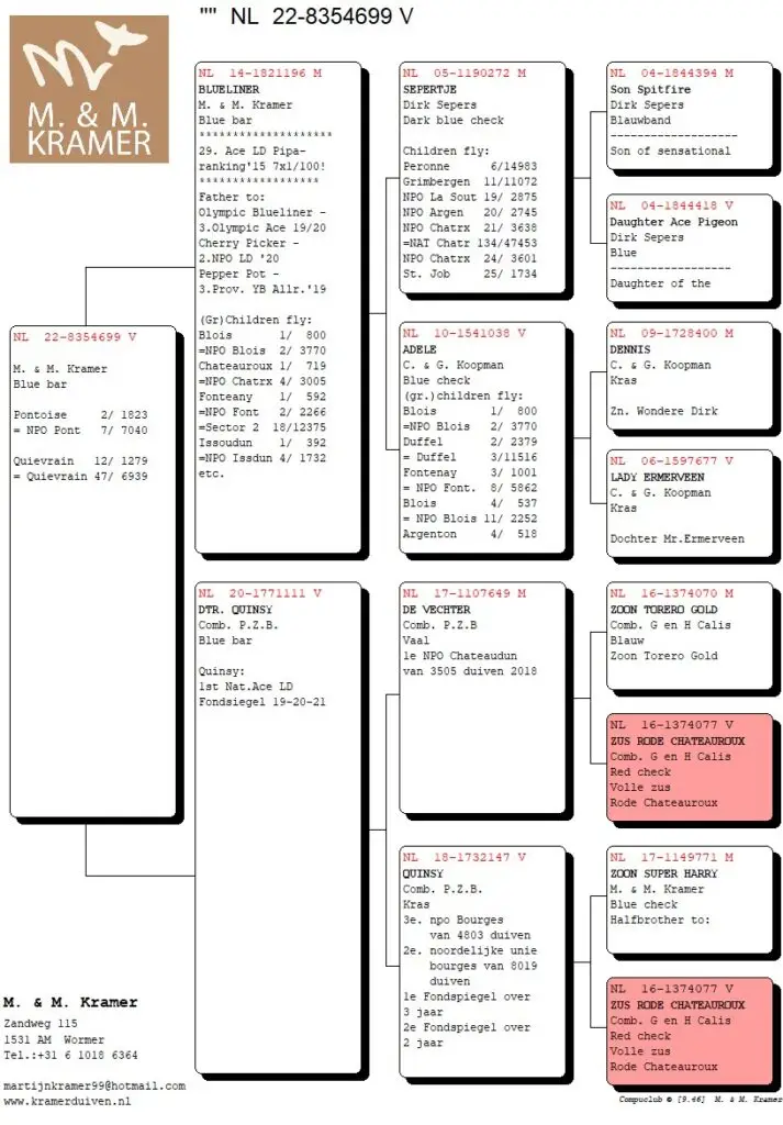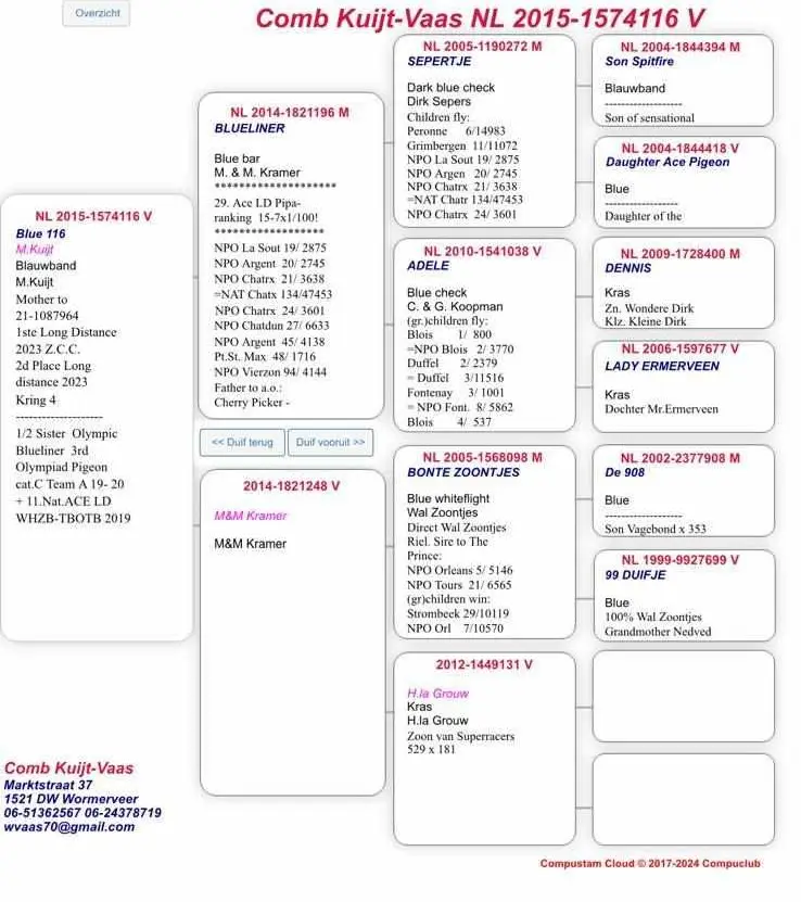 Comb. Kuijt-Vaas, al vaker genoemd, spelen de 2e in de afdeling met een duivin van wie de moeder bij ons vandaan komt en een dochter is van onze Blueliner. Deze duivin heeft Marcel eigenhandig destijds uit ons kweekhok geselecteerd uit de ploeg jongen. De 2e in de afdeling is dus een kleinkind van de Blueliner en zelf spelen we een 7e in de afdeling met een rechtstreeks kind uit hem. Voor de goede orde, deze duivin heeft vorig jaar niet gevlogen en dienst gedaan als weduw-duivin…