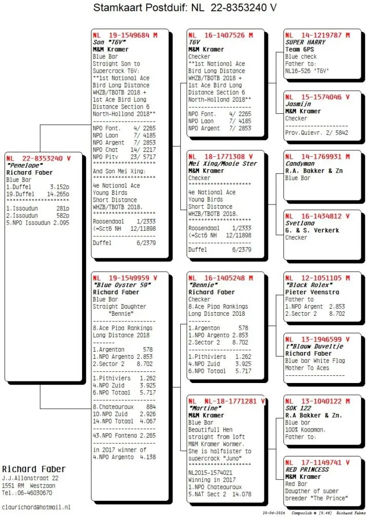 Richard Faber, Westzaan speelt de 1e van 3.237 duiven in Kring 3 met de ‘240’ (duivin). De vader komt bij ons vandaan en is een zoon van TGV. Vorig jaar vloog deze duivin al een 5e NPO vanuit Issoudun.