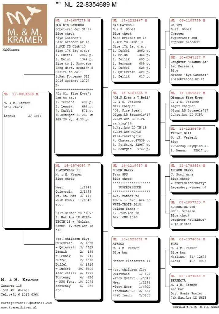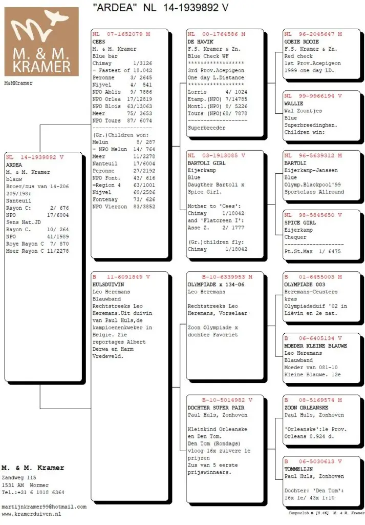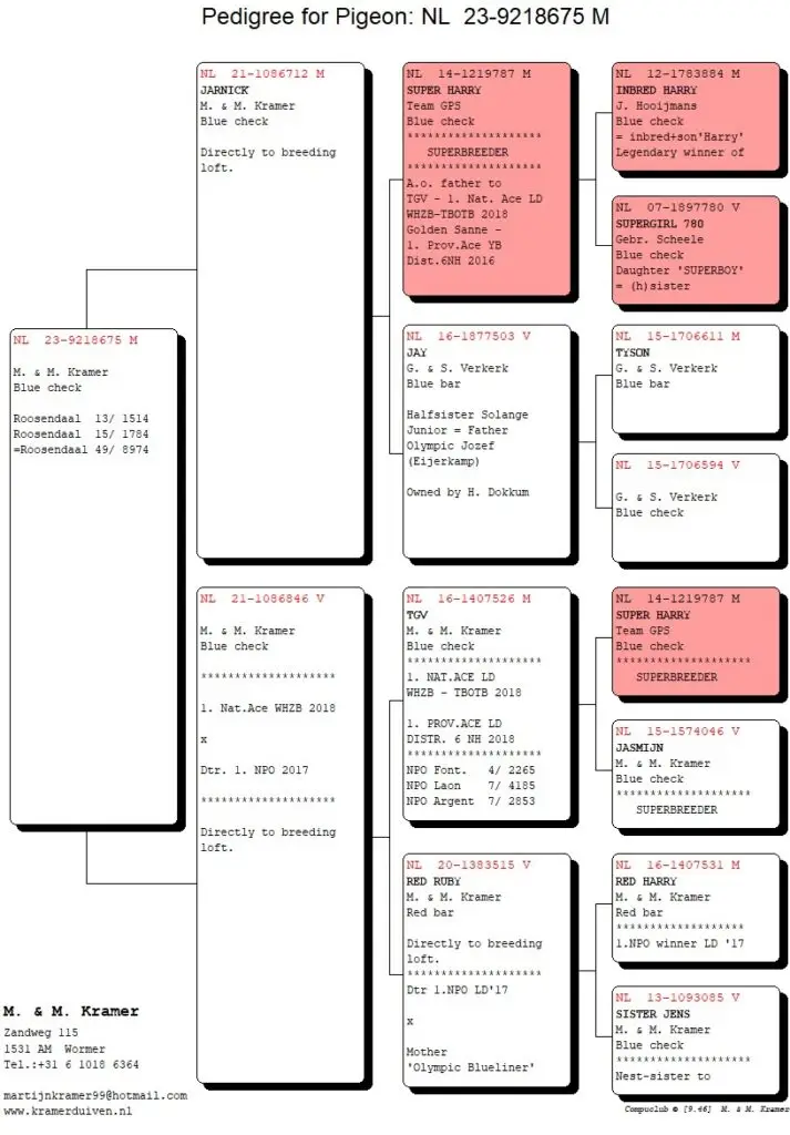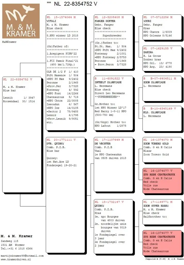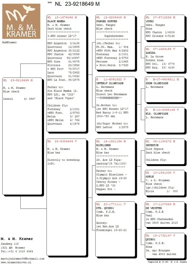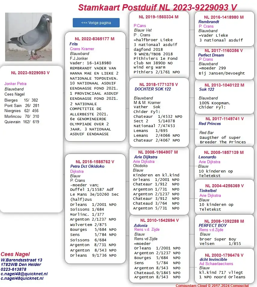 Het leuke van Compustam en Compuclub is dat je kunt klikken op de duiven in de uitslag. En tot mijn verbazing zag ik dat de overwinnar van Lennik van Cees Nagel (top gedaan Cees!) ook nog ‘ons’ bloed in zich draagt. Oké het is maar één van de grootouders, dus 25% maar het is wel een dochter uit Sok 122 (hé die heb ik meer gehoord). Dit keer gekoppeld aan Red Princess.